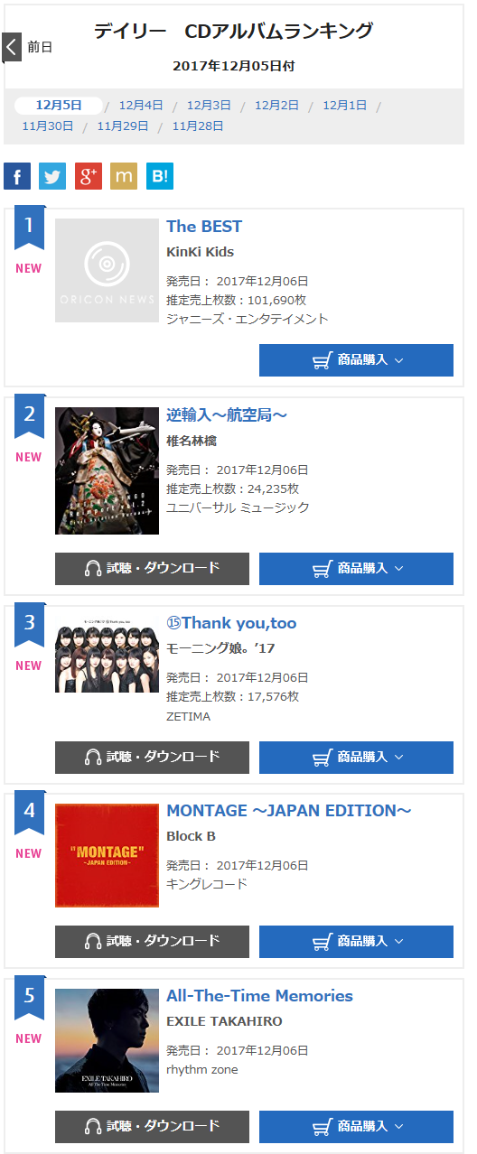 [KinKi Kids] 12/5 오리콘 데일리 랭킹 The BEST 1위