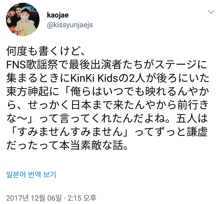 FNS歌謡祭で最後出演者たちがステージに集まるときにKinKi Kidsの2人が後ろにいた東方神起に「俺らはいつでも映れるんやから、せっかく日本まで来たんやから前行きな~」って言ってくれたんだよね。五人は「すみませんすみません」ってずっと謙虚だったって本当素敵な話。