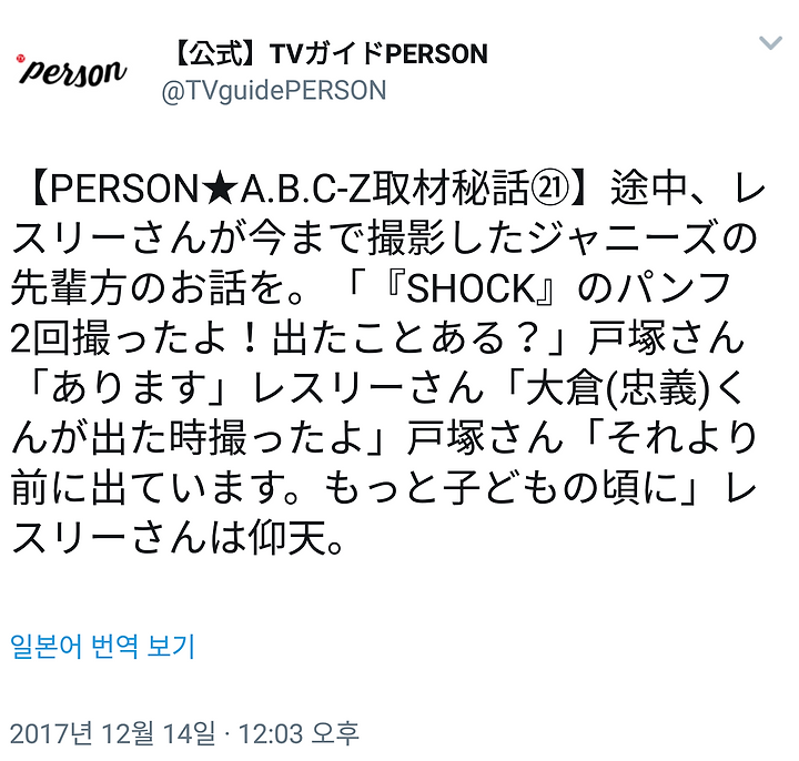 [PERSON★ A.B.C-Z취재 비화 ㉑] 도중 레슬리상이 지금까지 촬영한 쟈니스의 선배님의 이야기를."『 SHOCK』의 팜플렛 2번 찍었지! 나온 적 있니?" 토츠카상 "있습니다" 레슬리 씨"오쿠라군이 나왔을 때 찍었어" 토츠카 씨 "그것보다 전에 나왔었습니다. 더 어린 시절에" 레슬리상은 놀라는.