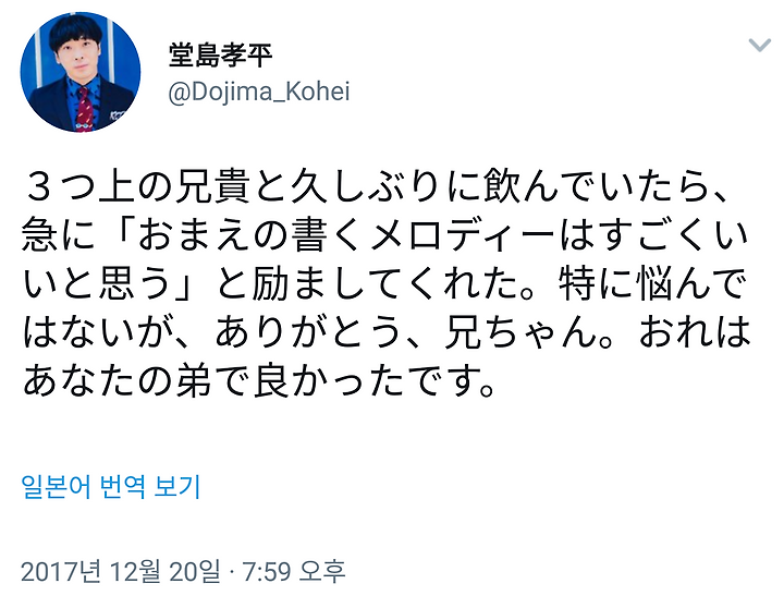 3살 위의 형과 오랜만에 마시고 있었는데 갑자기 "네가 쓰는 멜로디는 정말 좋다고 생각해"라고 격려해주었다. 딱히 고민하지는 않지만 고마워, 형. 나는 당신의 동생이어서 다행이었습니다.