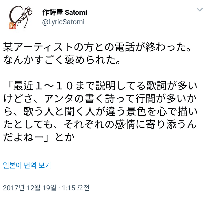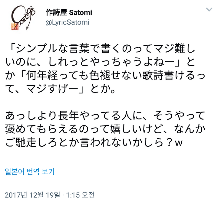 "단순한 말로 쓰기 정말 힘든데, 스리슬쩍~ 하고 해버리네"라든가 "몇 년이 지나도 빛바래지 않는 가사를 쓸 수 있다니, 정말 굉장해"라든가.