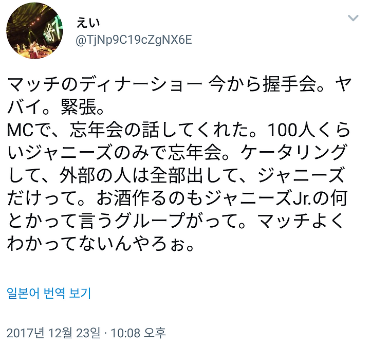 MCで、忘年会の話してくれた。100人くらいジャニーズのみで忘年会。ケータリングして、外部の人は全部出して、ジャニーズだけって。お酒作るのもジャニーズJr.の何とかって言うグループがって。マッチよくわかってないんやろぉ。