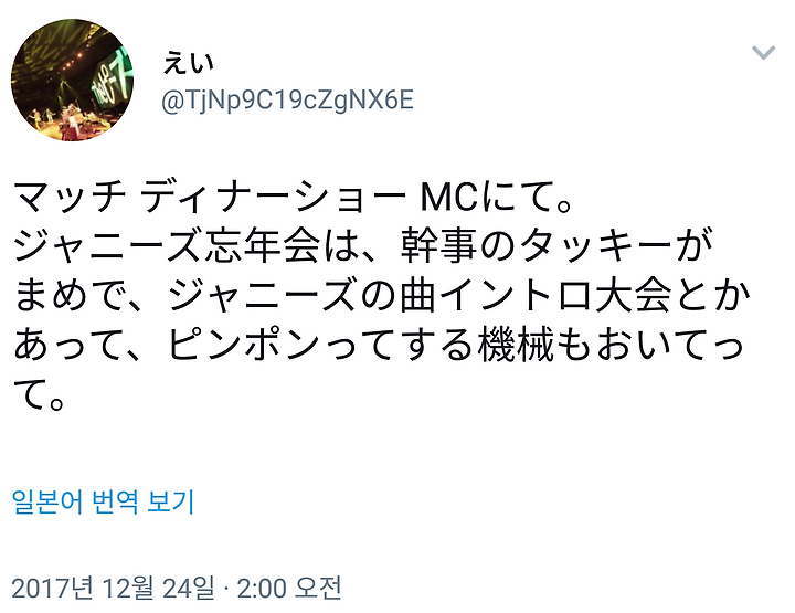 쟈니즈 망년회는 간사인 탓키가 성실해서 쟈니즈 곡 인트로 대회같은게 있어서 핑퐁! 하는 기계도 놓고... 라고.