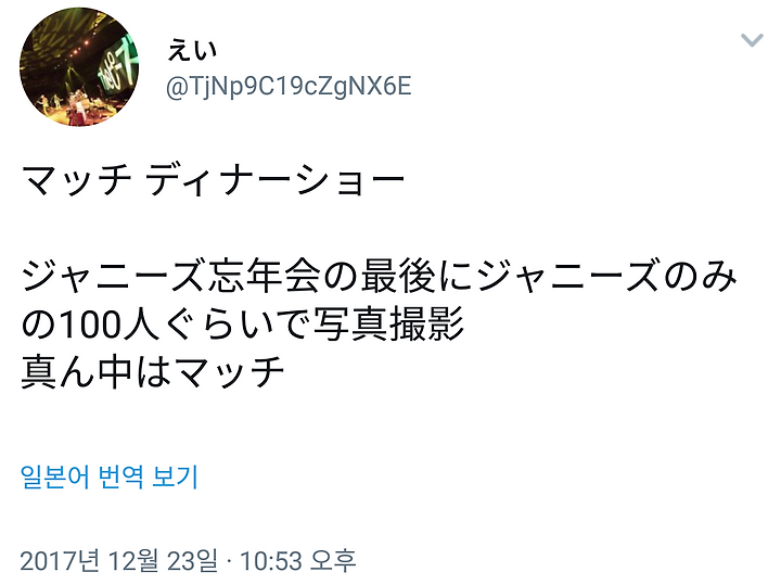 맛치 디너쇼에서 이야기된 쟈니즈 망년회에서의 "탓키가 간사" 라고 하는 정보로부터 "술을 만들어나 한 것도 쟈니즈 쥬니어의 뭐시기" 는 SnowMan 선배밖에 없다고 하는 확정으로 변한 느낌.