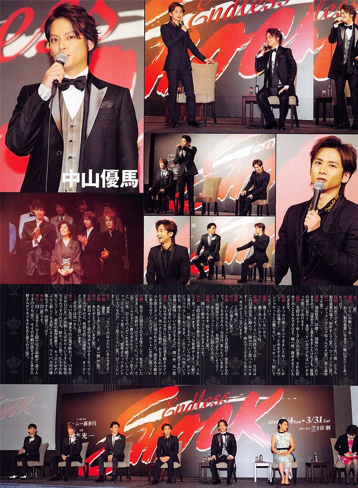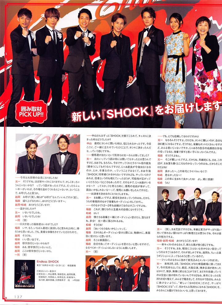 ■ 나카야마: 「SHOCK」는 저희들 후배 입장에서 보면 대단히 동경의 무대로, 언젠가는 저기에 서보고 싶다라고 하는 것은 아마 누구나가 생각하고 있는 무대라고 생각합니다. 볼만한 장면이 많이 담겨있고 정말로 눈깜빡임이 불가능할 것 같은 그런 한 순간 한 순간이 계속 흘러가는 무대이구나, 라는 인상입니다.