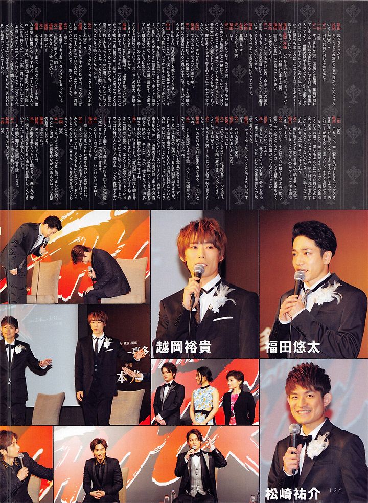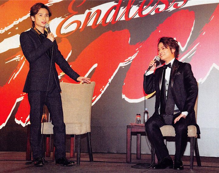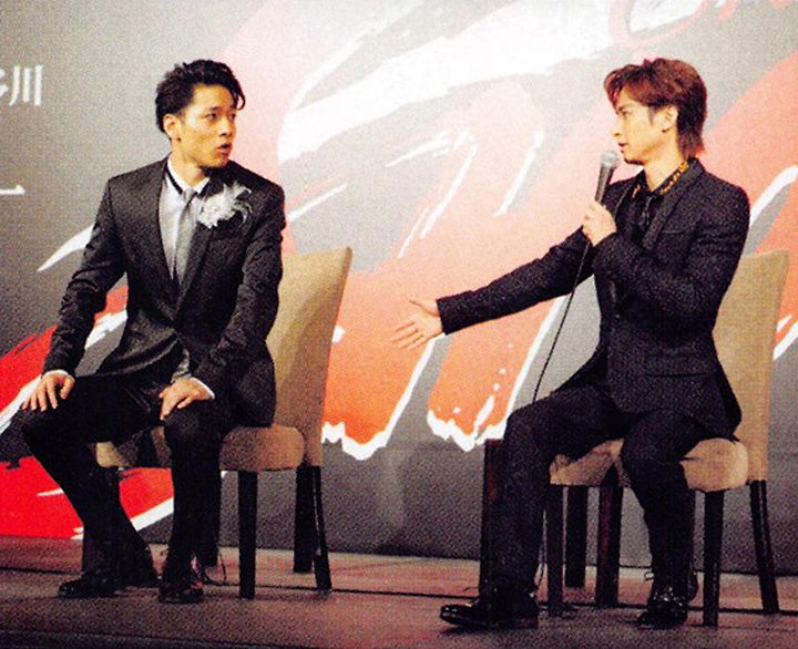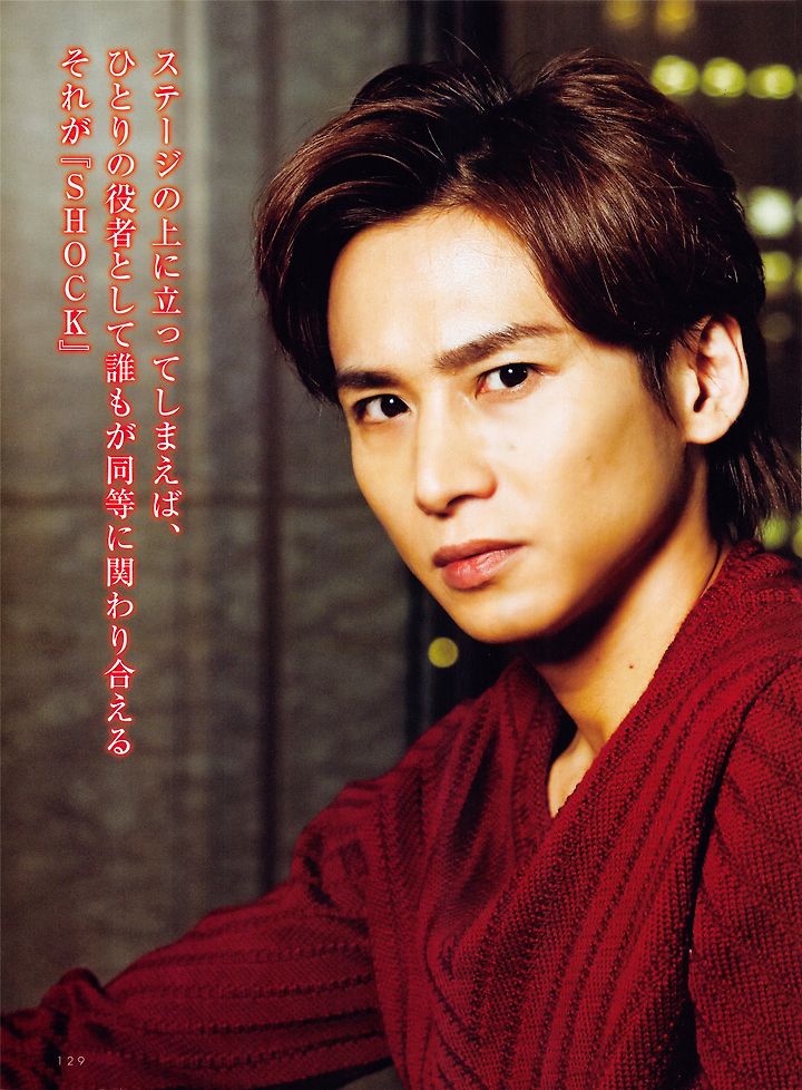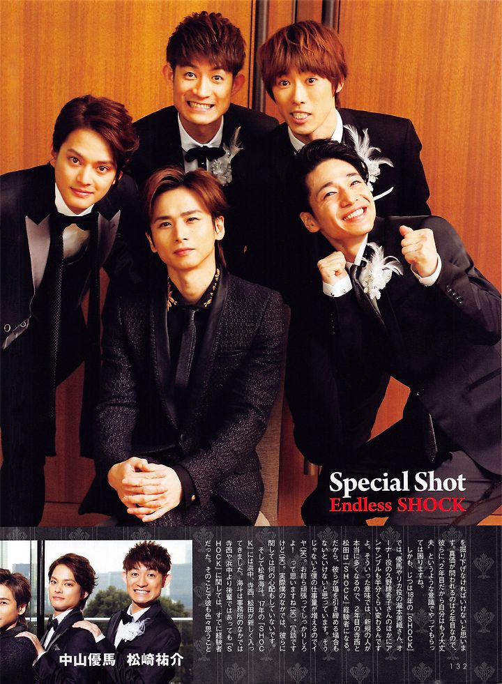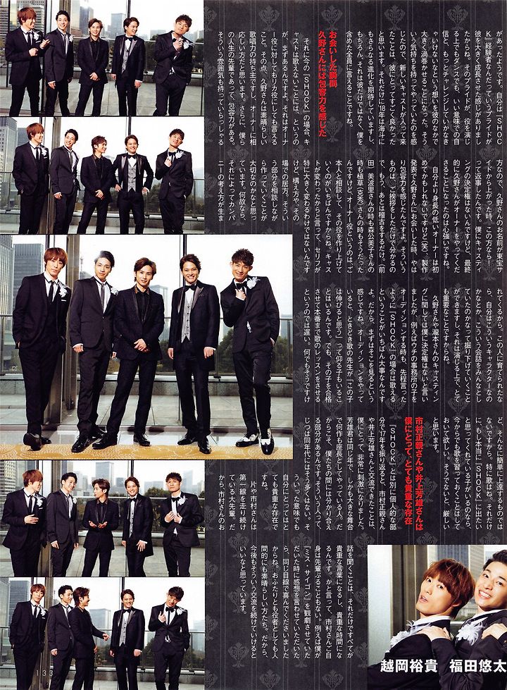 지금이니까 말할 수 있는 것입니다만, 그들은 그들대로 고민하던 시기도 있었어요. 사무소를 그만 두는 것도 시야에 넣고 있다고 상담을 받은 적도 있었으니까. 그 때 그렇게 생각할 것이 아니라, 지금 해야만 하는 것을 제대로 하면 보고 있는 사람은 보고 있을테니, 라는 이야기를 했던. 그 결과 지금에서는 그들 자신이 주연인 무대도 하고 있고, 「SHOCK」의 현장에서도 매우 자유롭게 해주고 있는. 그건 선배 후배라고 하는 입장으로 생각했을 때는 매우 기쁩니다. 하지만 아까도 말했듯이 막상 함께 무대 위에 서면 선배 후배 관계가 아니라 에너지를 발산하는 사이가 되는. 그걸 저로서는 더욱이 기쁘게 생각하고 있습니다.