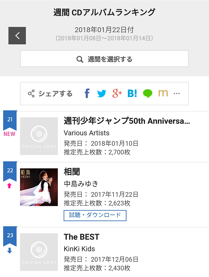 [KinKi Kids] 1/22부 오리콘 주간 앨범 랭킹 : The BEST (23위)