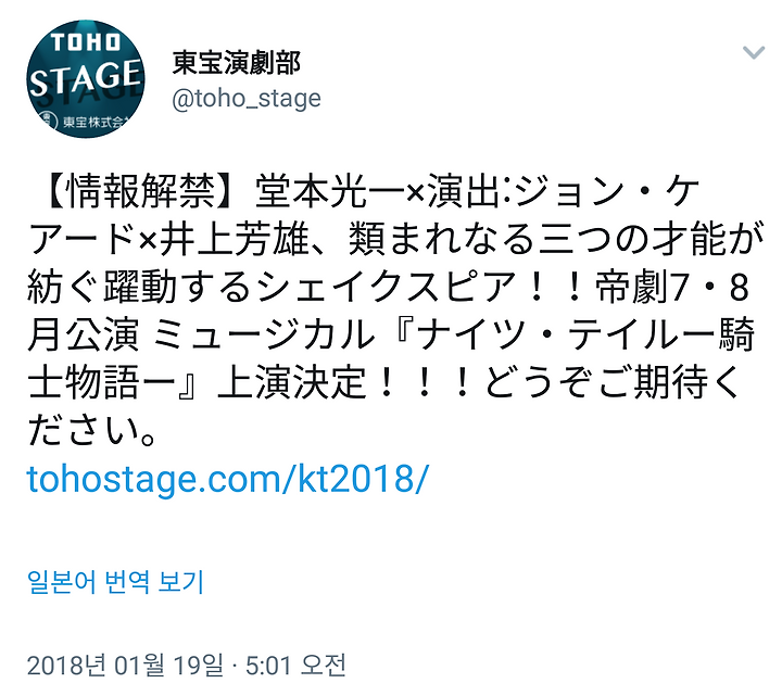 [도모토 코이치] 1/19 뮤지컬「ナイツ・テイル-騎士物語- (나이츠 테일 -기사 이야기-)」TOHO 공식 HP