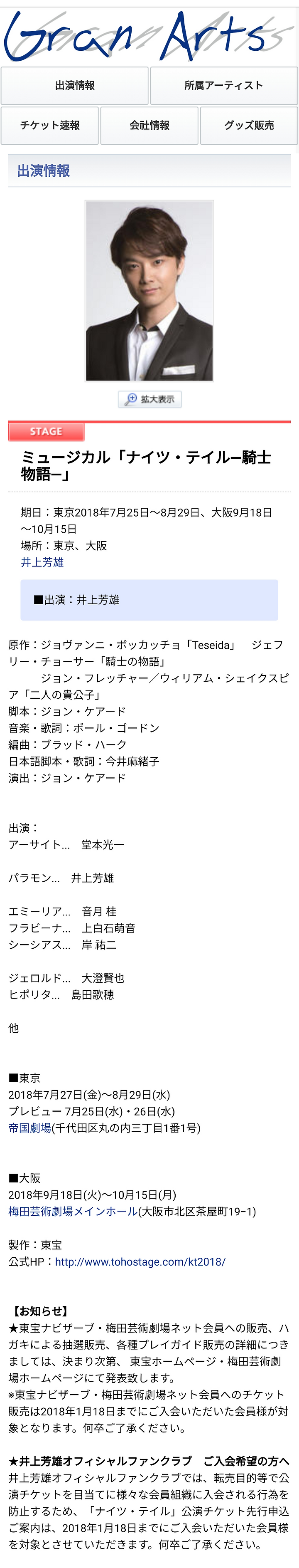 이노우에 요시오 오피셜 팬클럽에서는, 전매 목적 등으로 공연 티켓을 목적으로 다양한 회원 조직에 가입하는 행위를 방지하기 위해서 "나이츠 테일"공연 티켓 선행 신청 안내는 2018년 1월 18일까지 입회하신 회원을 대상으로 하겠습니다. 아무쪼록 양해 바랍니다.