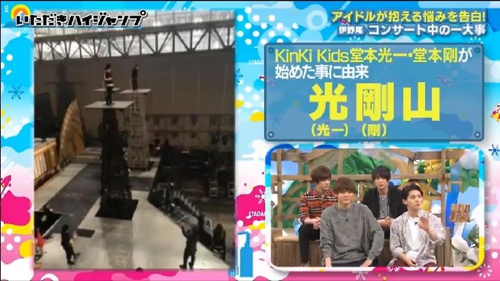 光剛山(こうごうさん)の話は2013年の1月にKAT-TUNのラジオで田口と中丸くんがライブで怖いセットは?って話しから『高いタワー…あれ光剛山って呼んでる…僕らの中では。あのKinKi Kidsが初めて使ったから。光一の光と剛の剛を使って光剛山って』既に話してたけどね…