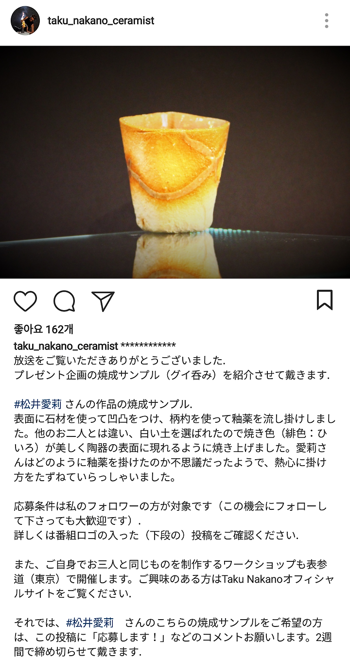 - 저(taku_nakano_ceramist)의 인스타그램의 팔로워가 대상입니다.
