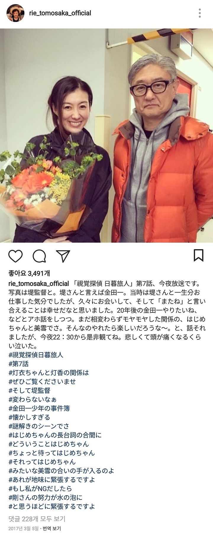 rie_tomosaka_official「視覚探偵 日暮旅人」第7話、今夜放送です。写真は堤監督と。堤さんと言えば金田一。当時は堤さんと一生分お仕事した気分でしたが、久々にお会いして、そして「またね」と言い合えることは幸せだなと思いました。20年後の金田一やりたいね、などとアホ話をしつつ。まだ相変わらずモヤモヤした関係の、はじめちゃんと美雪でさ。そんなのやれたら楽しいだろうな〜。と、話それましたが、今夜22:30から是非観てね。悲しくて頭が痛くなるくらい泣いた。