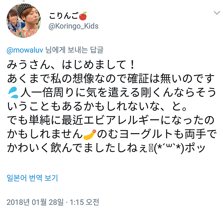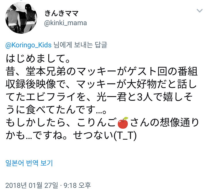 옛날, 도모토 쿄다이의 맛키가 게스트인 회 방송 녹화 후 영상에서 맛키가 좋아하는 음식이라고 말한 새우 튀김을 코이치군과 3명이서 기쁘게 먹었었죠.