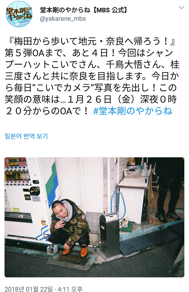 『우메다에서 고향 나라까지 걸어서 돌아가자!』 제 5탄 OA까지 앞으로 4일! 이번엔 샴푸 해트 코이데상, 치도리 다이고상, 카츠라 산도상과 함께 나라를 목표로 합니다. 오늘부터 매일 "코이데 카메라" 사진을 선공개! 이 미소의 의미는.. 1월 26일(금) 심야 0시 20분 OA에서! #도모토 쯔요시의 야카라네