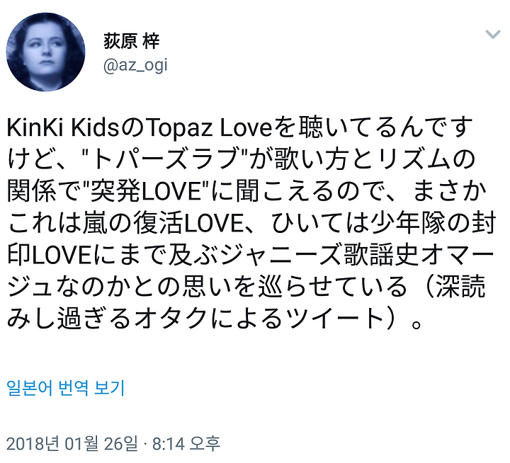 KinKi KidsのTopaz Loveを聴いてるんですけど、"トパーズラブ"が歌い方とリズムの関係で"突発LOVE"に聞こえるので、まさかこれは嵐の復活LOVE、ひいては少年隊の封印LOVEにまで及ぶジャニーズ歌謡史オマージュなのかとの思いを巡らせている(深読みし過ぎるオタクによるツイート)。
