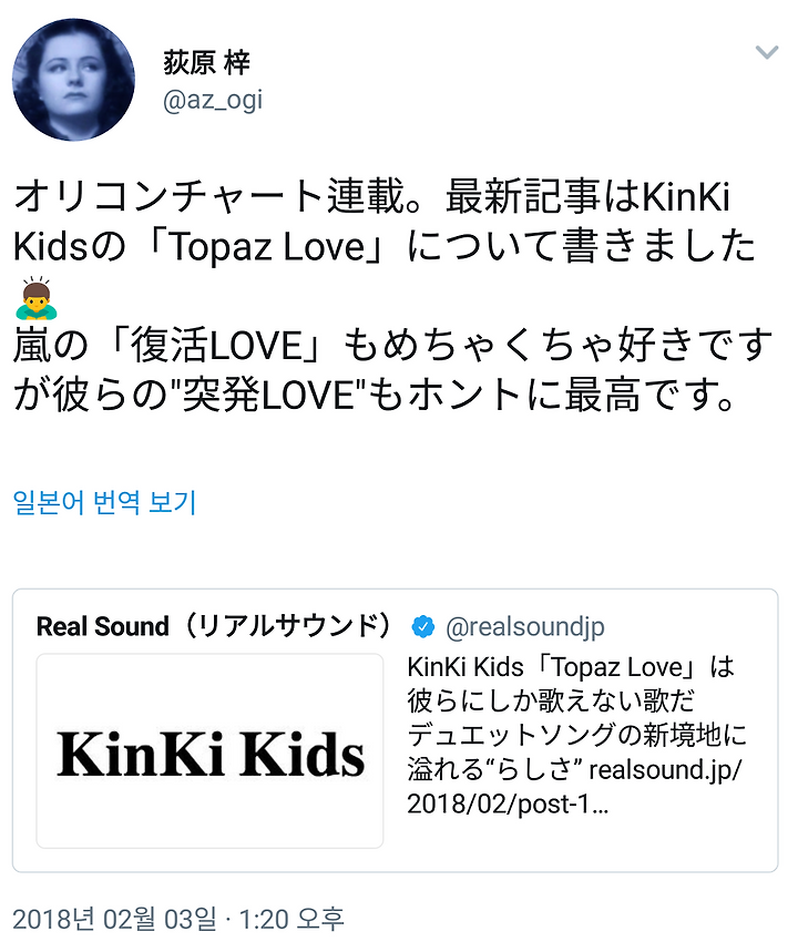 2018년 2월 5일자 오리콘 주간 CD싱글 랭킹 1위는 KinKi Kids의 『Topaz Love/DESTINY』. 데뷔 39작품 연속으로 선두를 획득했다. 이번에는 그 가운데 "Topaz Love"쪽에 주목하고 싶다.