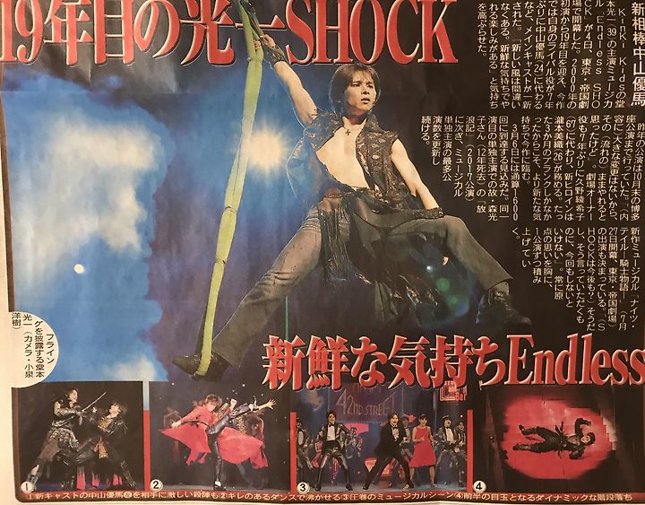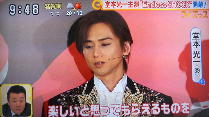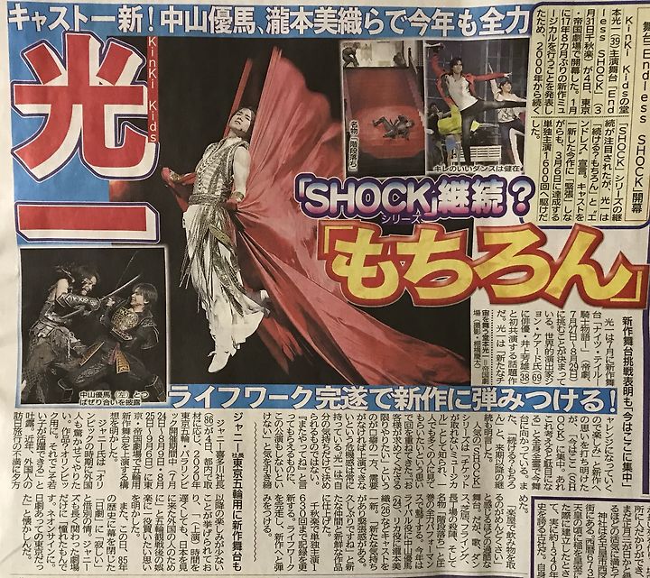3월 6일에는 통산 1600회에 달할 전망이다. 동일 공연의 단독 주연으로 고 모리 미츠코씨(12년 사망)의 "방랑기"(2017공연)에 이어 뮤지컬 단독 주연의 최다 공연 수를 갱신한다. 신작 뮤지컬 "나이츠 테일 ― 기사 이야기 ―" (7월 27일 개막, 도쿄 제국 극장)의 출연도 정해졌다. "(SHOCK는 앞으로도) 그렇고, 그렇게 말해주시는 것으로 이번에도 하지 않으면 안 된다" 항상 원점의 생각을 가슴에 1공연씩 쌓아 간다.