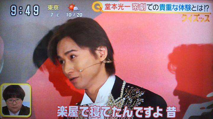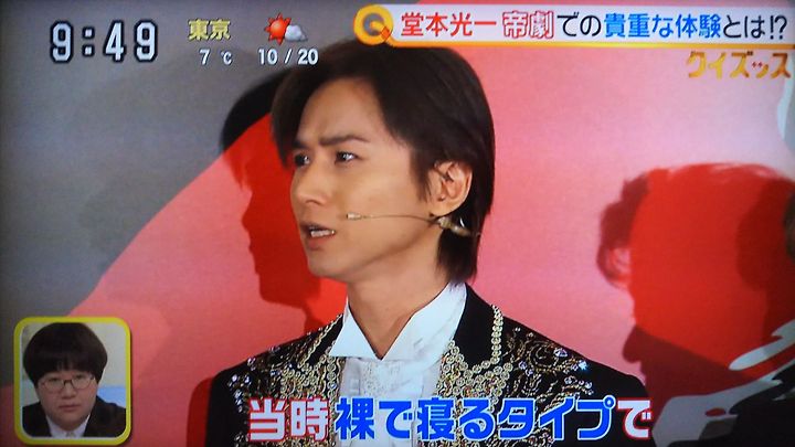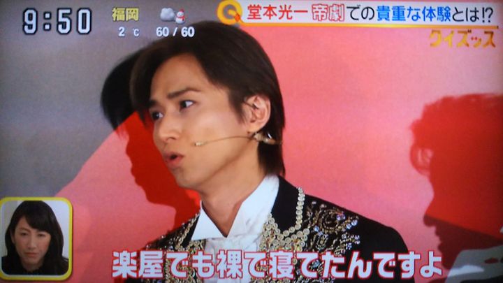 ■ 도모토: 복은 잔뜩 있다고 생각합니다. SHOCK 를 하기 시작했을 때는 시간이 없어서 연습도 숙박하며 했던 적이 있습니다. 그럴 때라든지, 자시키와라시(복을 가져다 주는 신)이 자주 달려다녀요~ 라고 들었습니다. 그런데 말이죠, 제가 대기실에서 자고 있었더니 아침 9시정도이려나요. 철컥하고 문이 열렸어요. 현재는 개를 키우고 있기 때문에 옷을 입고 잡니다만, 당시는 알몸으로 잤어서... 이불을 끌어 안고 있는 듯한 느낌으로 엉덩이가 전부 나온 상태로 자고 있었더니 문이 열려서 자시키와라시인가 생각했더니 청소 아주머니까 꺄악! 하고. 저도 졸렸기 때문에 아무런 반응도 하지 않았습니다만.