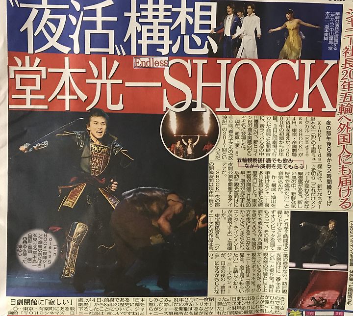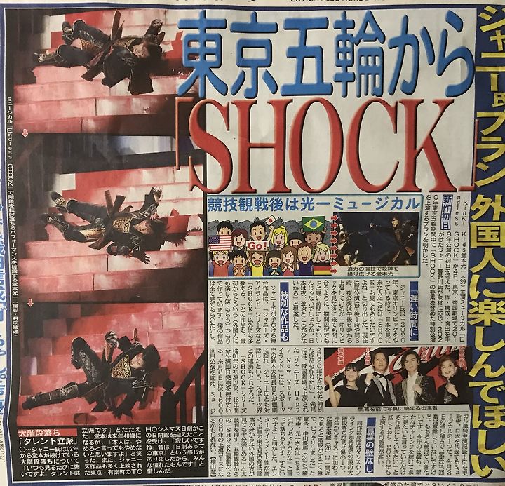 2020년 도쿄 올림픽이 2년 반 후로 다가오면서 쟈니씨는 "『SHOCK』나 일본의 무대는 대단하다고 외국분들이 생각하게 만들고 싶다. 낮에 올림픽 경기를 보고 밤에 무대를 봐주었으면 한다"라고 열변. 밤 공연의 시작을 오후 6시 이후로 늦추는 방안도 내걸며 "나의 작품은 전부 봐주었으면 좋겠다. 올림픽용으로 새롭게 만들거에요"라고 의욕을 보였다.