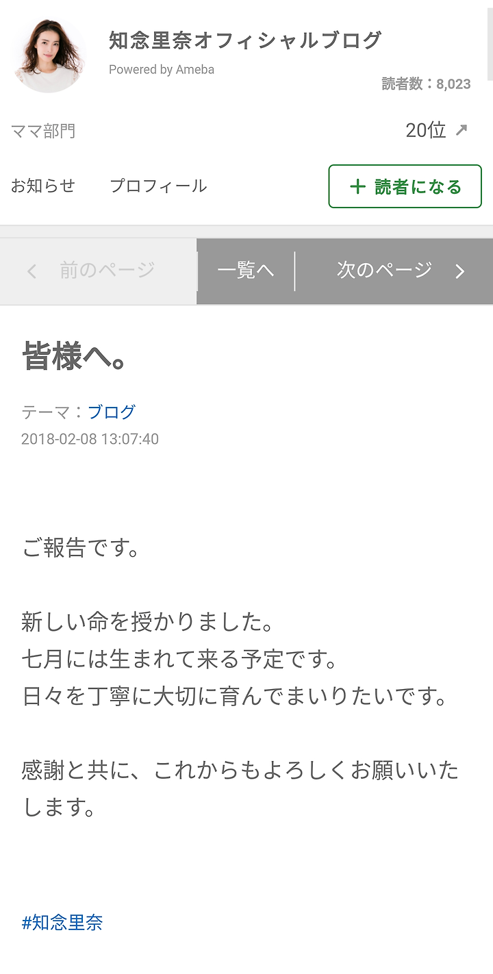 치넨은 "보고입니다" 의 서두로 "새로운 생명을 얻었습니다"라고 보고. "7월에는 태어날 예정입니다" 라고 밝히며 "매일을 정중히 소중히 키워가고 싶습니다. 감사와 함께 앞으로도 잘 부탁 드립니다" 라고 메세지를 하고 있다.