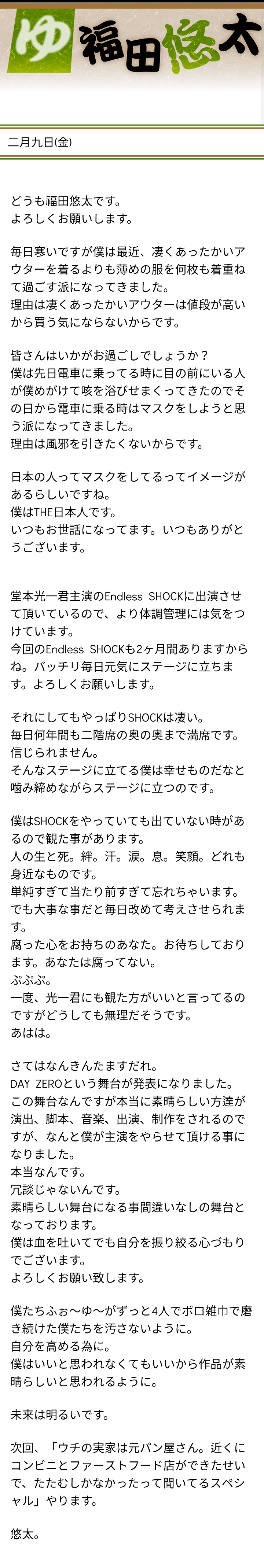 도모토 코이치군 주연의 Endless SHOCK에 출연하고 있기 때문에 보다 몸 컨디션 관리에는 조심하고 있습니다.