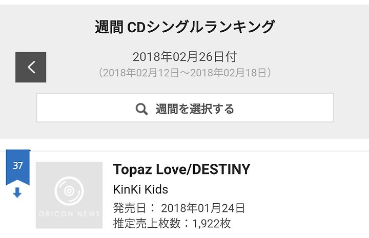 [KinKi Kids] 2/26부 오리콘 주간 싱글 랭킹 : Topaz Love/DESTINY (37위)