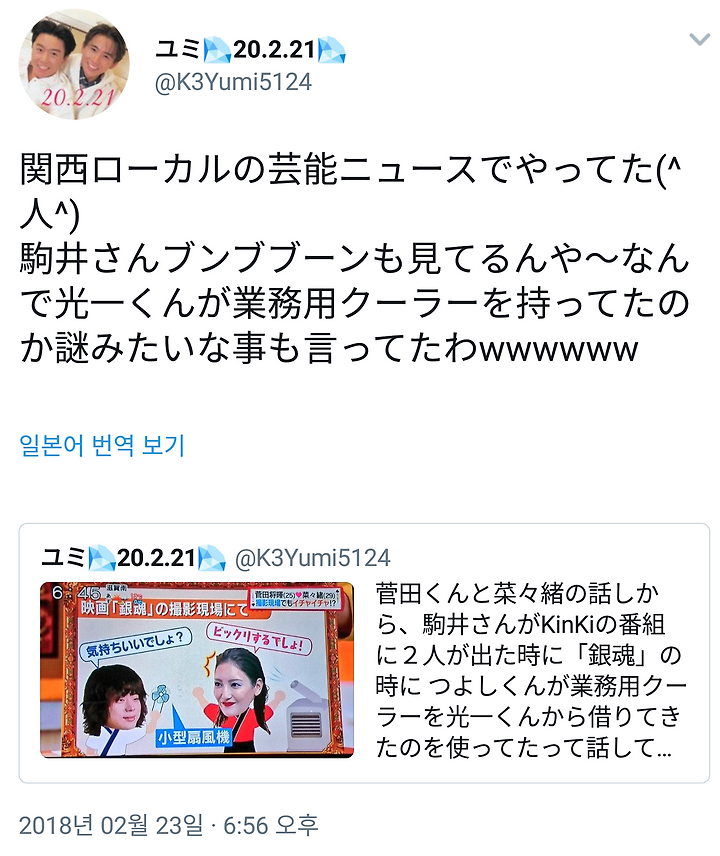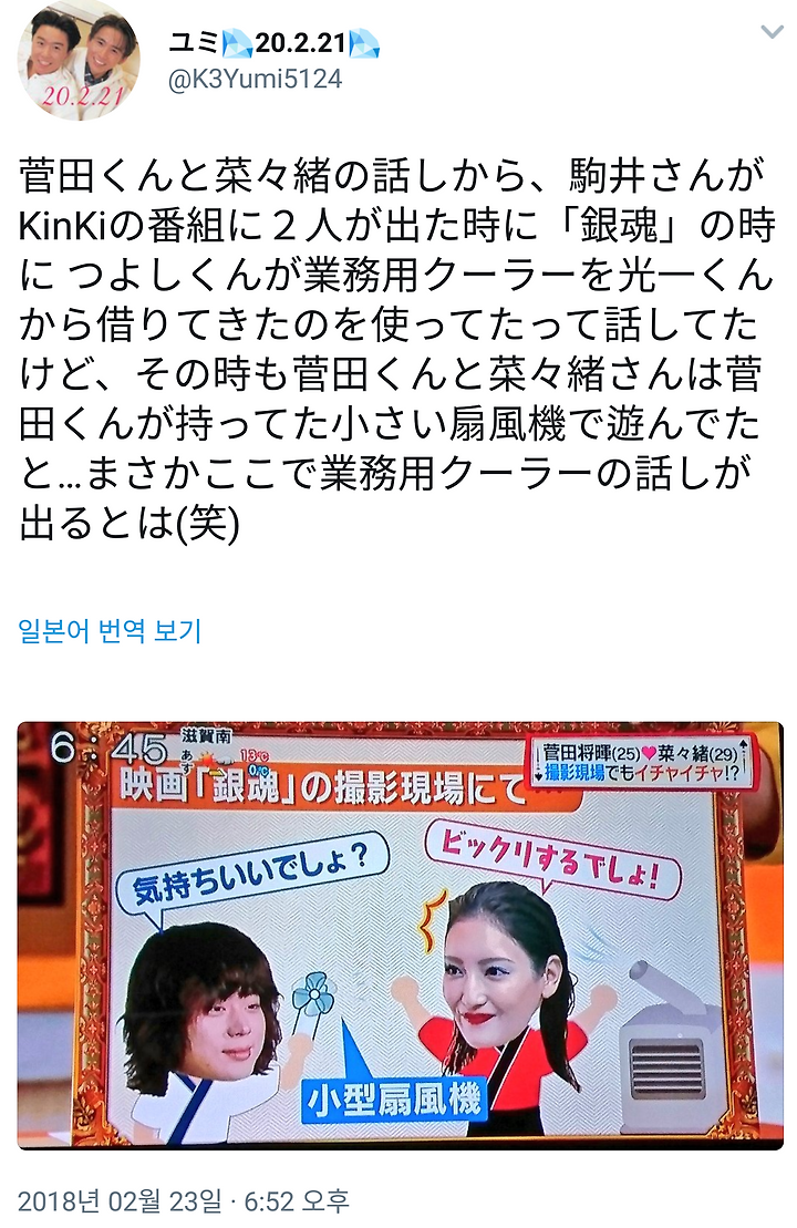 스가군과 나나오의 이야기에서 코마이상이 KinKi 방성에 둘이 나왔을 때, "은혼"때 쯔요 군이 업무용 쿨러를 코짱으로부터 빌려고 온 것을 사용했다고 말했었는데, 그때도 스다군과 나나오상은 스다군이 들고 있는 작은 선풍기로 놀았다며...설마 여기에서 업무용 쿨러의 이야기가 나올줄은 ㅎㅎ