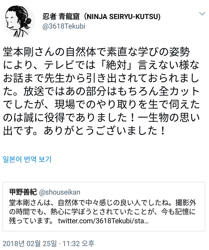 堂本剛さんの自然体で素直な学びの姿勢により、テレビでは「絶対」言えない様なお話まで先生から引き出されておられました。放送ではあの部分はもちろん全カットでしたが、現場でのやり取りを生で伺えたのは誠に役得でありました!一生物の思い出です。ありがとうございました!
