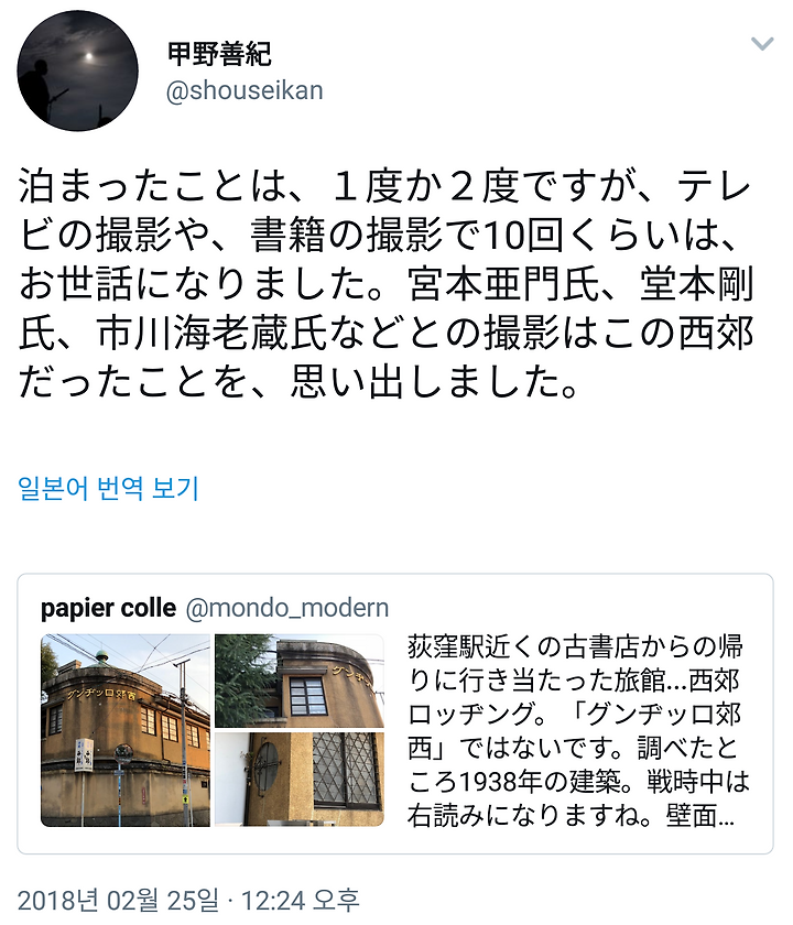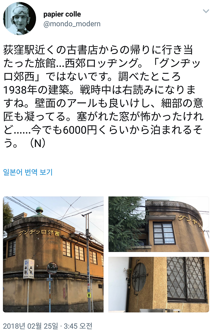 오기쿠보역 근처의 고서점에서 돌아오는 길에 맞닥뜨린 여관... "세이코우 롯징(Lodging)". "궁짓로 코우세이"는 아닙니다. 알아보니 1938년의 건축. 전쟁 중은 오른쪽 방향 읽기였지요. 벽면적도 좋고 세부 디자인도 공들인. 막혀있던 창문이 무서웠지만...... 지금도 6000엔 정도로 묵을 수 있다고 하는.