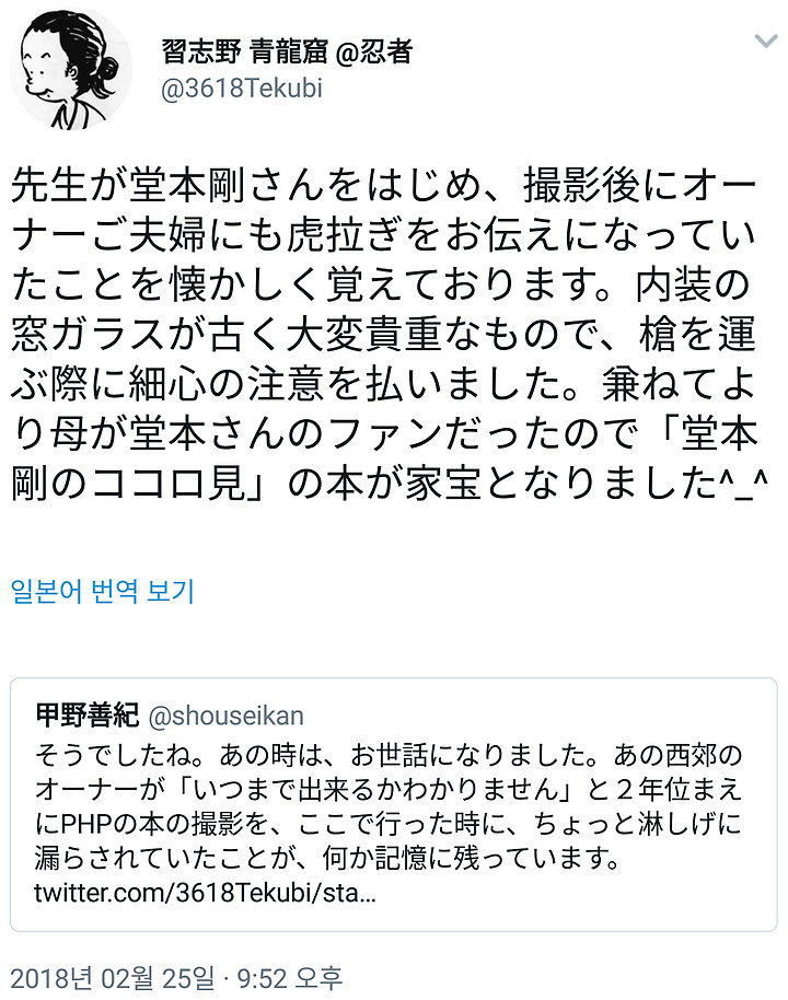 선생님이 도모토 쯔요시씨를 비롯한 촬영 후에 주인 부부께도 토라히지기를 전해주셨던 것을 그립게 기억하고 있습니다. 내부 인테리어의 유리창이 낡고 매우 귀중한 것으로, 창을 옮길 때 세심한 주의를 기울였던. 또 어머니가 도모토씨의 팬이었기 때문에 "도모토 쯔요시의 코코로미"의 책이 가보가 되었습니다 ^_^