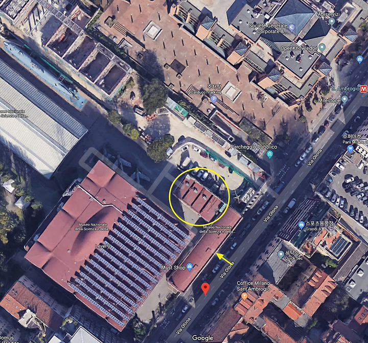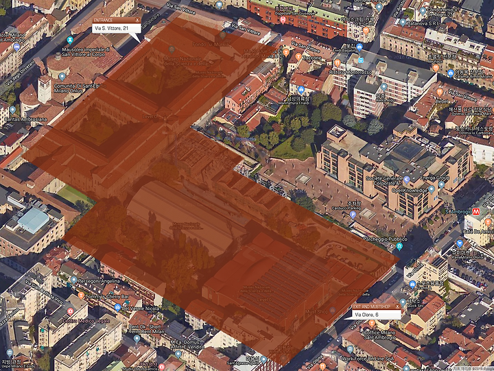 이 넓은 박물관 부지에서 저 윗쪽(Via S. Vittore, 21) 이 입구이고, 아래쪽(Via Olona, 6)이 출구.