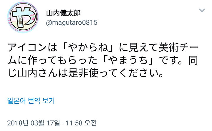 vアイコンは「やからね」に見えて美術チームに作ってもらった「やまうち」です。同じ山内さんは是非使ってください。