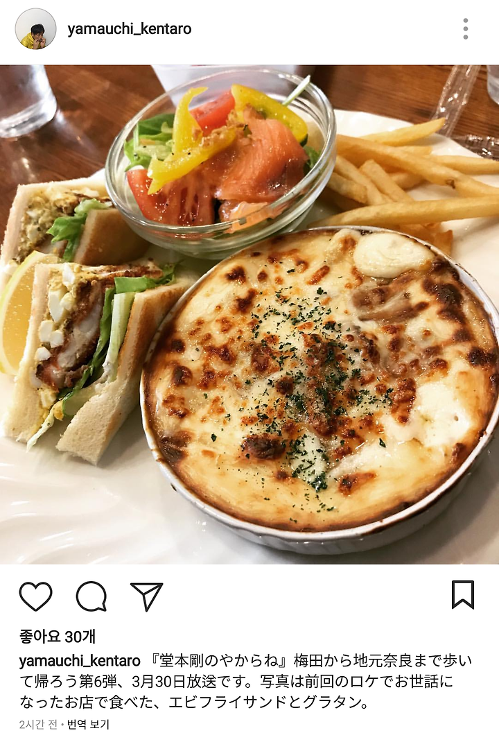 yamauchi_kentaro『堂本剛のやからね』梅田から地元奈良まで歩いて帰ろう第6弾、3月30日放送です。写真は前回のロケでお世話になったお店で食べた、エビフライサンドとグラタン。