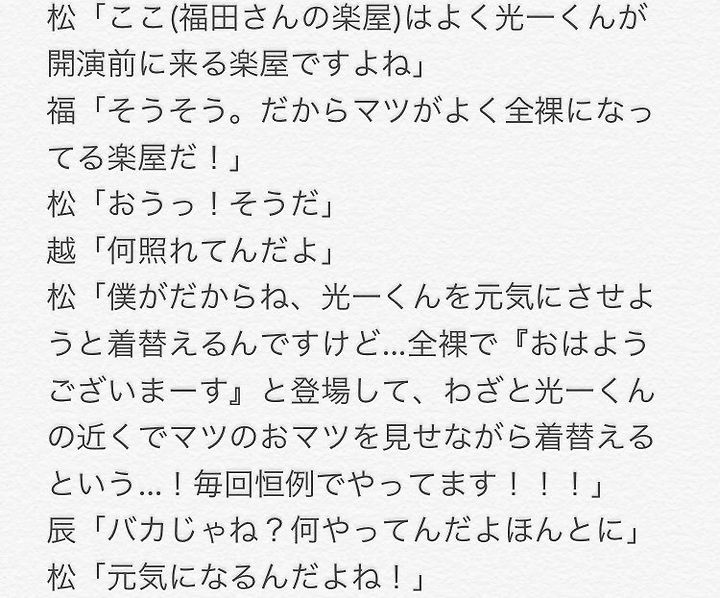 で俺が全裸でワザと光一くんに松のオマツを見せつけながら本番前に着替えるっていうね!」