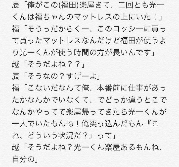 ■ 타츠미: 내가 이 (후쿠다의) 대기실에 와서, 두 번 다 코이치군은 후쿠짱의 매트리스 위에 있었어!