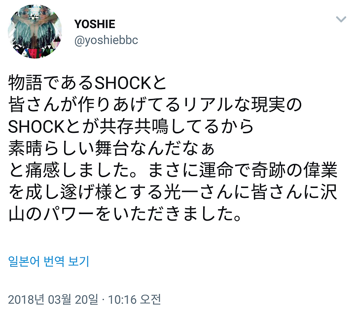 [도모토 코이치] 3/20 YOSHIE상 트윗 (3/19 SHOCK 관극)