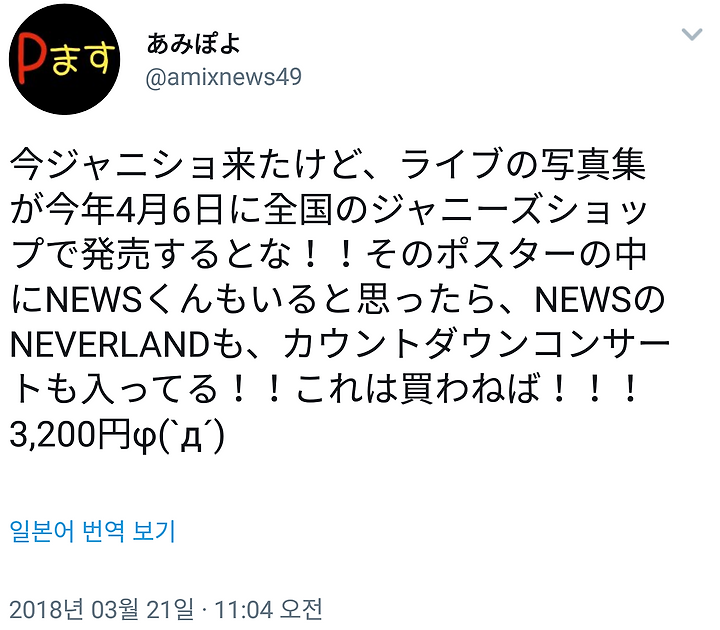 지금 쟈니즈샵 왔는데 라이브 사진집이 올해 4월 6일 전국 쟈니즈샵에서 발매된대. 그 포스터 중에 NEWS군도 있네 싶었더니 NEWS의 NEVERLAND도 카운트다운콘서트도 들어있어. 이건 사지 않으면!! 3200엔