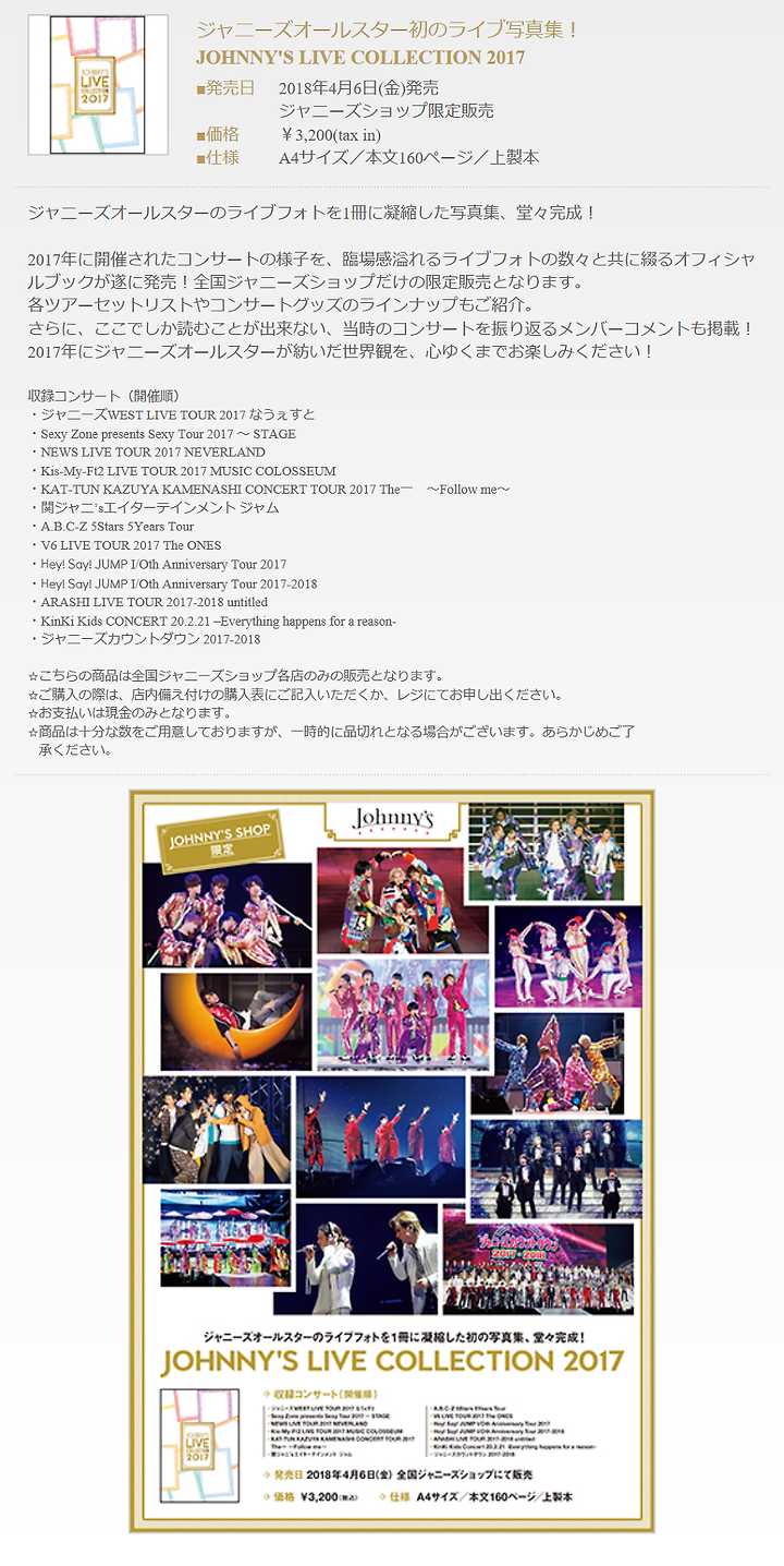 Johnny's LIVE collection 2017 이라는 사진집 내는거네. 3200엔 (A4 사이즈)