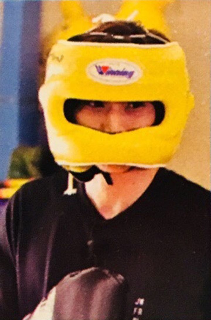 무에타이 선수 등이 머리에 쓰고 있는 "몬콘"을 장착하고 싸움에 준비하는 쯔요시.