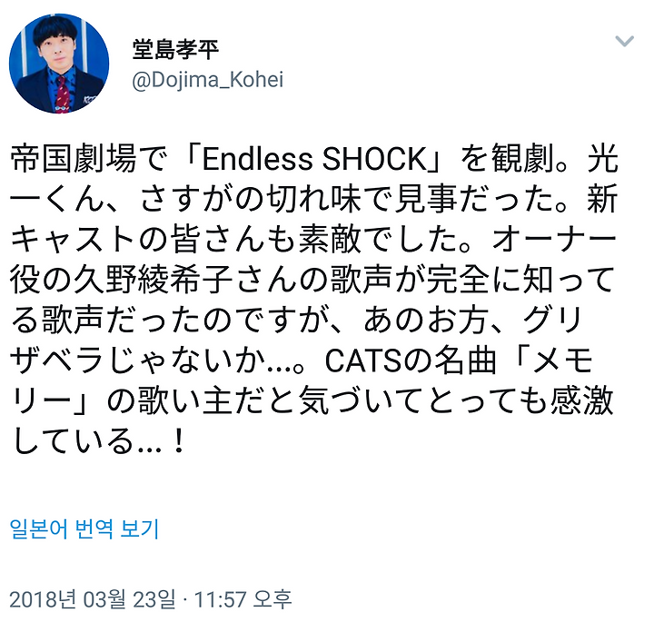 제국 극장에서 "Endless SHOCK"를 관극. 코이치군, 역시 훌륭했다. 새 캐스트들도 멋졌어요 오너 역의 쿠노 아키코씨의 노랫 소리가 완전히 아는 노랫 소리 였는데, 그분, 그리자벨라잖아. CATS의 명곡 "메모리" 의 노래주인공 이라고 알고 매우 감격하고 있다...!