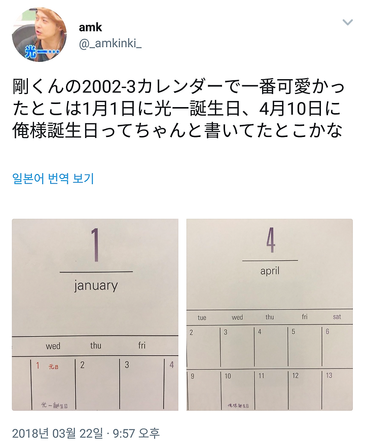 剛くんの2002-3カレンダーで一番可愛かったとこは1月1日に光一誕生日、4月10日に俺様誕生日ってちゃんと書いてたとこかな