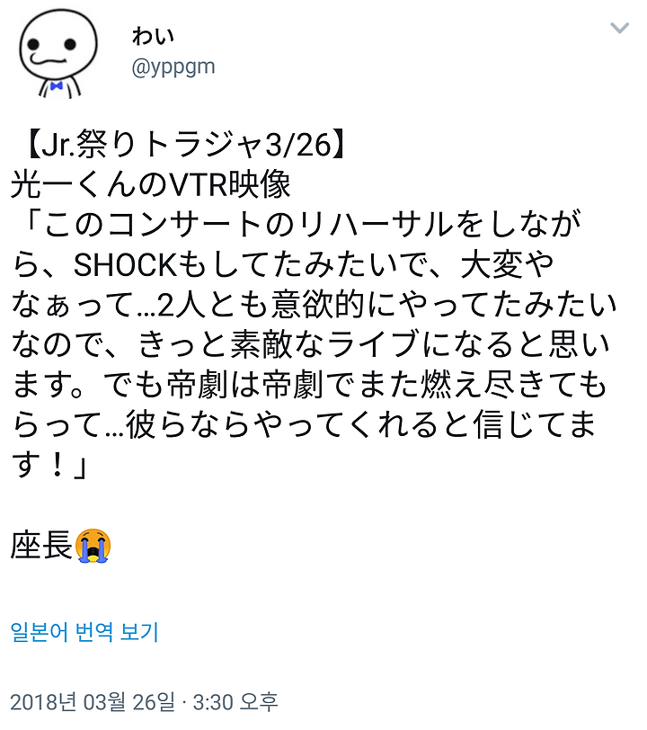 "이 콘서트의 리허설을 하면서, SHOCK도 했던 것 같아서 힘들겠네... 하고. 둘 다 의욕적으로 했던 것 같으니 분명 멋진 라이브가 될 것이라고 생각합니다. 하지만 제극은 제극으로, 또 다 불태워주시고... 그들이라면 해줄 것이라고 믿습니다!"