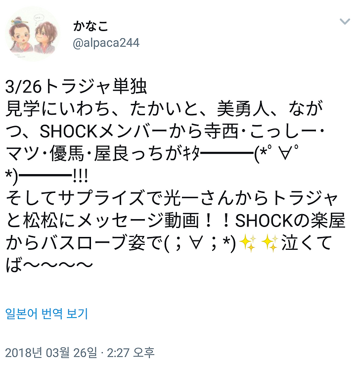 그리고 써프라이즈로 코이치씨로부터 트래비스 재팬과 마츠마츠에세 메시지 영상!! SHOCK의 분장실에서 바스로브 차림으로(;∀;*)✨ ✨ 눙물~