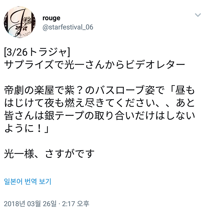 코이치상의 "트래비스 재팬으로 다 불태울 때까지 하고, 극에 건강하게 돌아와서, 또 밤 공연에서 다 타올라주세요" 라는 말이 진짜 상냥하고 상냥하고 상냥해서 눈물이 났다. 마츠마츠의 표정도 잊을 수 없다.