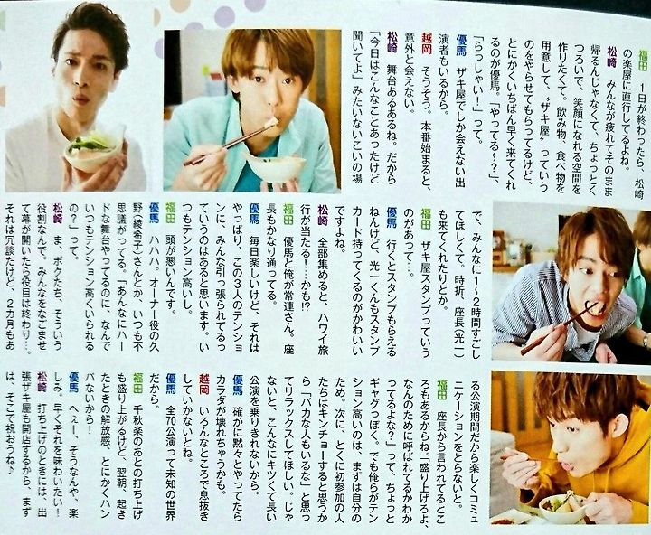 ■ 마츠자키: 쿠노상이라고 하니까 지금 생각났습니다. 어제 이야기에요. 어제 공연 끝나고 마침 식사회가 있었어요. 코이치군도 함께. 집합 장소가 정해졌기 때문에 "좋아, 나갈까~" 했더니 "있지~(쿠노상 모노마네)" 쿠노상이 훅 하고 자키야에 오셔서