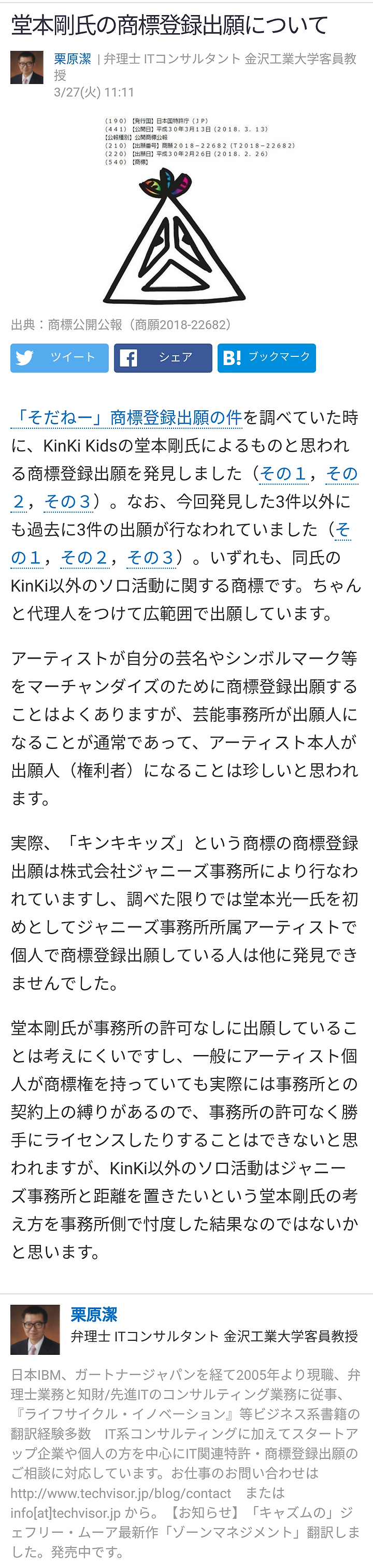 도모토 쯔요시씨가 사무실의 허가 없이 출원했다고는 생각하기 힘들고, 일반적으로 작가 개인이 상표권을 갖고 있어도 실제로는 사무소와의 계약상의 묶음이 있으므로 사무실 허가 없이 마음대로 라이센스 할 수 없다고 생각되지만, KinKi 이외의 솔로 활동은 쟈니즈 사무소와 거리를 두겠다는 도모토 쯔요시씨의 생각을 사무소 측에서 헤아리긴 결과가 아닐까 생각합니다.