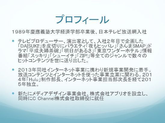 今日はせっかくですので、「なんで日本テレビを辞めてベンチャーに行ったのか」ということや、ベンチャーのC Channelでどういうことをやっているのかをご説明しながら、最後はみなさんといろいろとお話ができればと思っています。