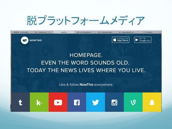 それからソーシャルプラットフォームを使った動画配信で新しいのが、これはけっこう昔から言われていますけれども、最近僕が注目しているものでいうと「Now This!」というサービス。