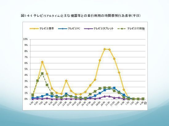 それから、(次のスライドで)テレビと携帯を一緒に見ているというのが黄色ですけれども、つまりテレビだけで見ているというよりは、モバイルと一緒に見ているという状況があります。