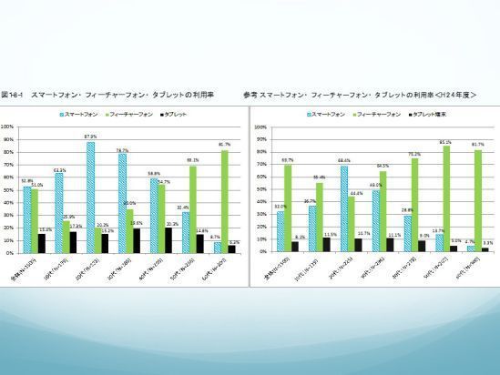 水色がスマホを使っている人たちで、これはちょっと古いデータで申し訳ないんですけれども、どんどん伸びてきて、とくに若い世代はほとんどというような状況で、完全にモバイルに移ってきているという状況だと思っています。